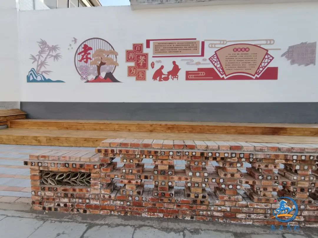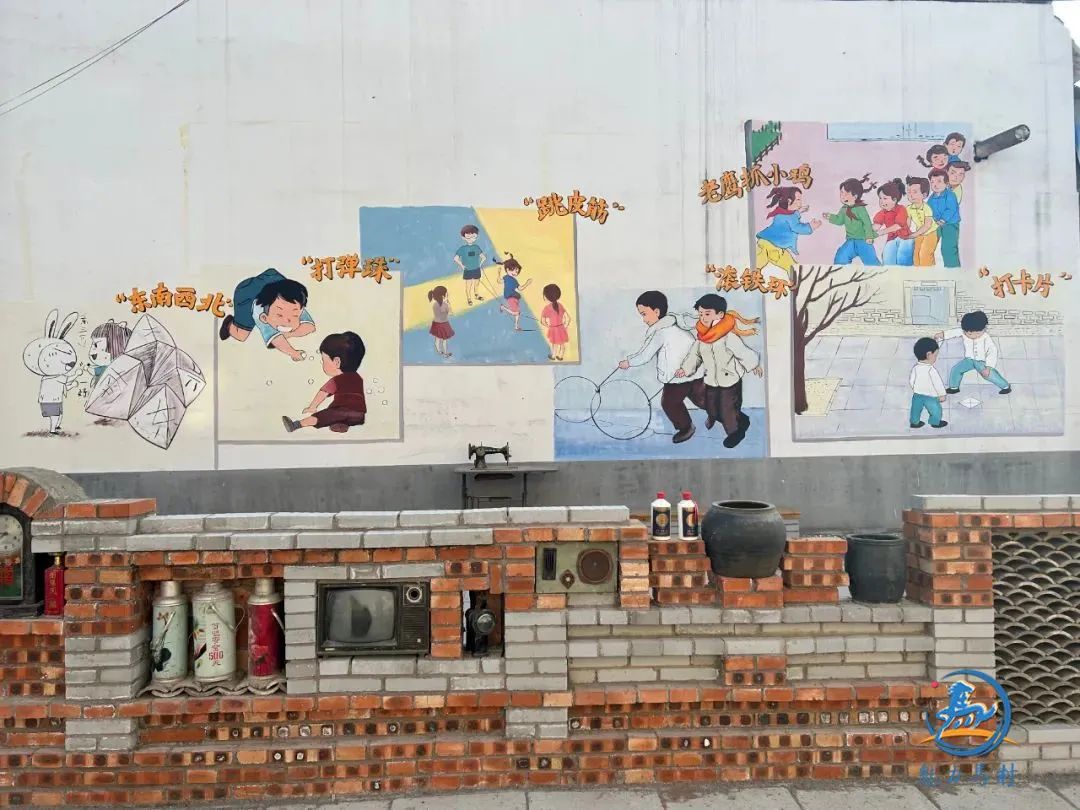 文化墙前,红砖砌的围栏内,镶嵌着老电视、收音机、座钟、酒坛等一件件充满时代气息的老物件,满怀着几代人青春年华的风雨见证,沉积着平淡岁月中的日日相依。
