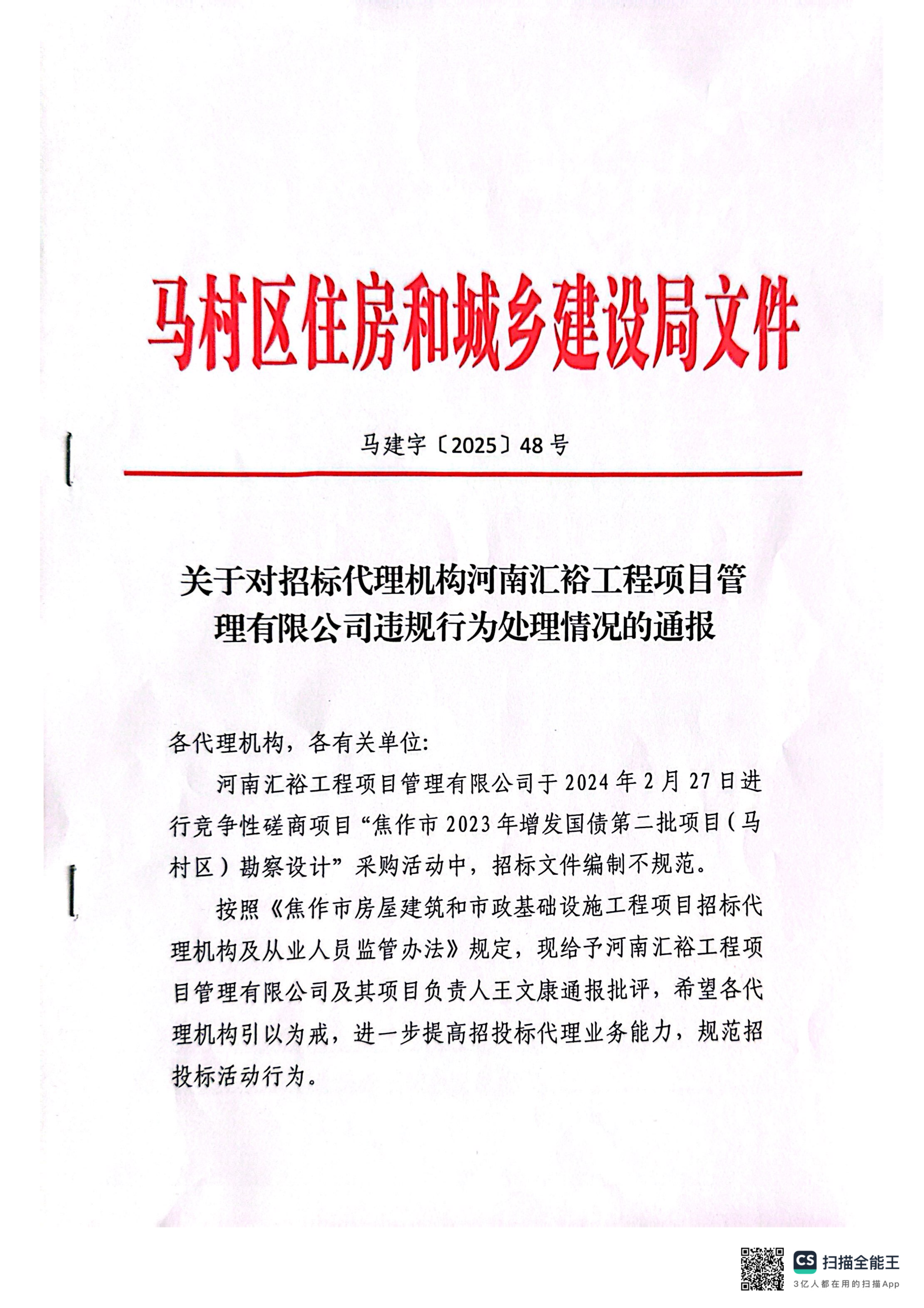 河南汇裕工程项目管理有限公司违规行为处理情况的通报