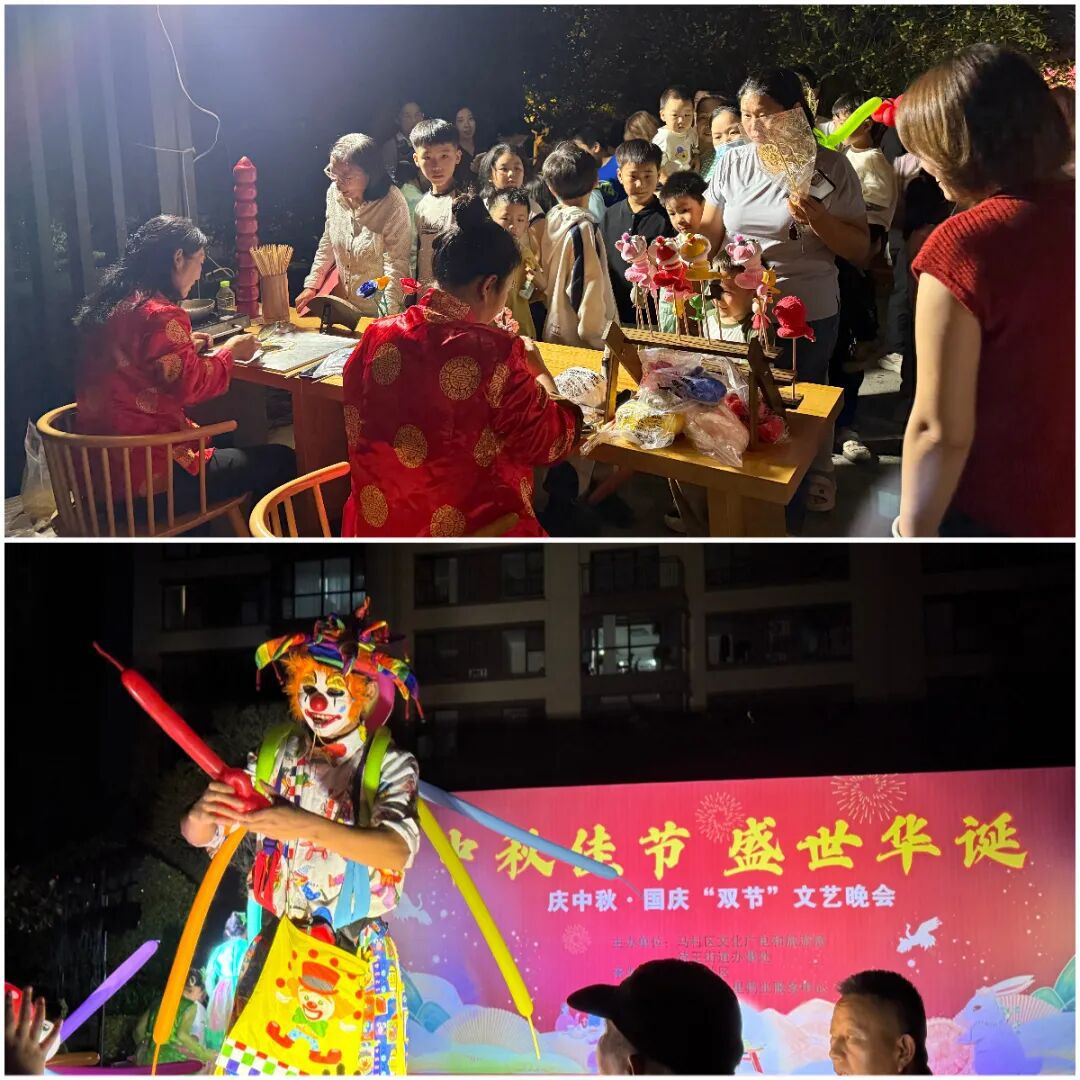 晚会现场气氛热烈,节目丰富多样。开场,小丑以其滑稽幽默的表演迅速点燃全场热情,引得居民们笑声连连。天河之畔艺术团带来的《祝福祖国》团体舞,舞者们身姿轻盈、动作整齐,用优美的舞姿抒发着对祖国深深的热爱,赢得阵阵掌声。