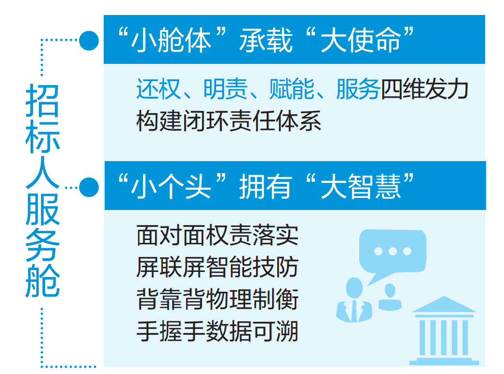 现场可见,电视屏幕实时切换显示开标流程与评标现场,专家入场、通信工具存放等环节全程可视。“四维赋能”压实责任,“小舱体”承载“大使命”。服务舱虽小,却能通过“还权、明责、赋能、服务”四维发力,构建闭环责任体系——